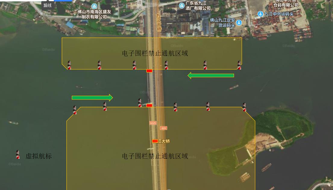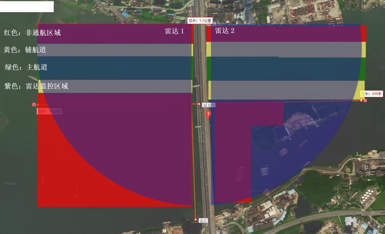 系統把大橋上下游400米內的非航道區域設置為電子圍欄偏航檢測區,一旦檢測到船舶進入