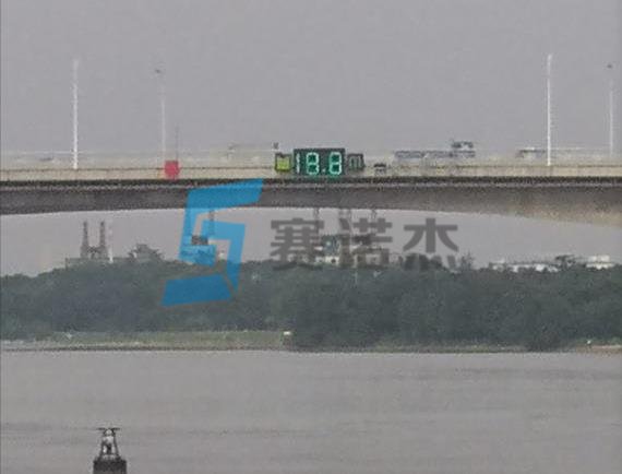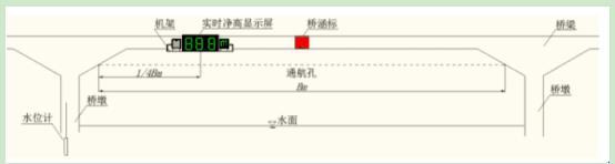 LED顯示屏安裝在通航孔上方面對來船方向,距橋墩約1/4通航孔凈寬處,若有來船,顯示屏會實時同步水位的數據,顯示當前通航的凈高。而此顯示屏由圖案顯示屏、數字顯示屏、字母顯示屏及支架組成。設計在橋梁通航孔上下游方向迎船面安裝遙控LED顯示標志,效果如下圖所示:
