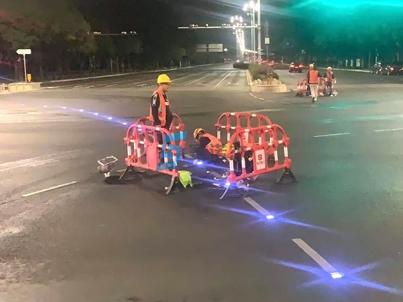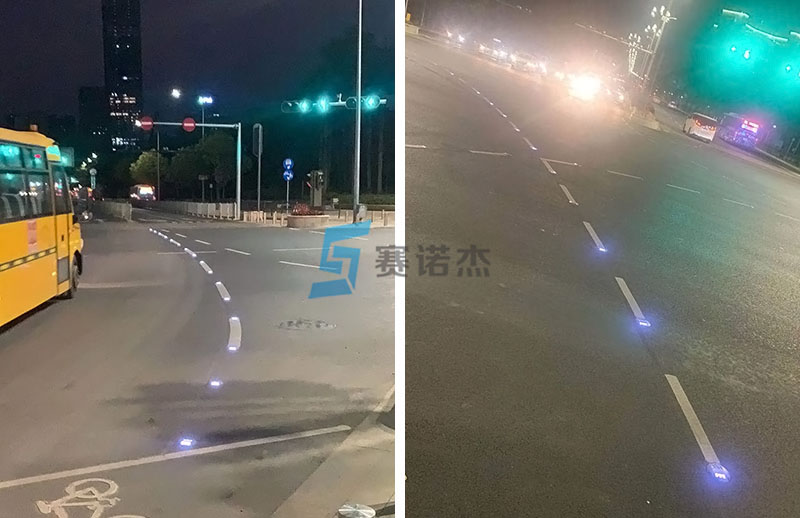 了解到這個難點與痛點以后,我司將原來給歐洲機場的一款發光有源道釘通過光學設計改型以后,用在深圳市紅荔路的6個主要十字路口,在接受信號機左拐綠燈信號后,通過白光形成導流線,較好地解決了十字路口導流線晚間亮度不夠的問題。