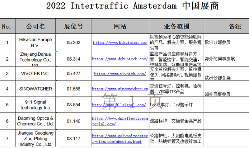 2022 Intertraffic RAI Amsterdam 這是新冠疫情以來的首次舉辦,也是2020年展會的順延,無論是阿姆斯特丹市政府、舉辦方還是參展商,都為此大費周折。受交通、物流等價格影響,直接導致展商預算增加到疫情之前的三倍,這也導致很多中國公司與少部分歐美公司放棄參展或布展(其實往屆中國大陸公司參展很踴躍),我們在展會逐一走訪清點統計,發現中國大陸共有???、大華、道明、賽諾杰等10家廠商參展。