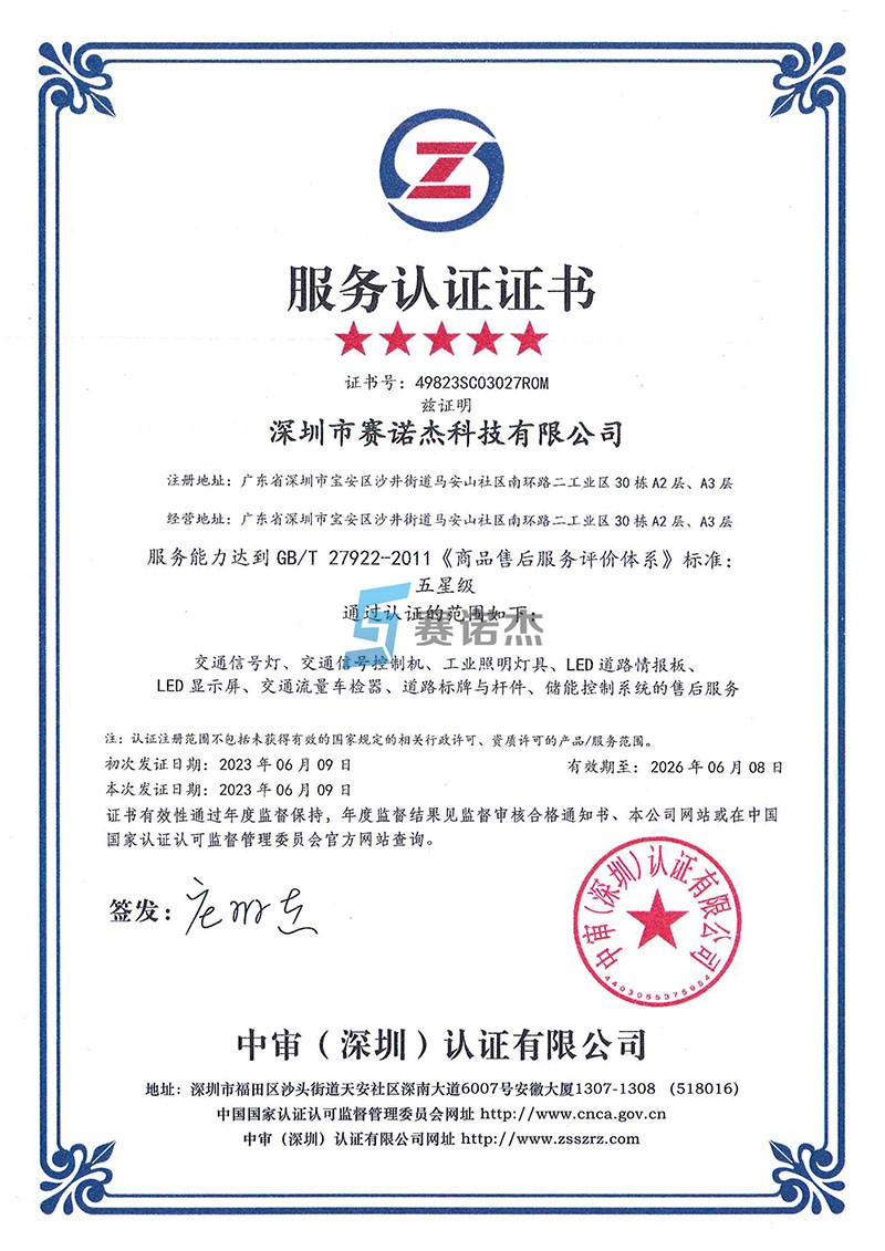售后服務認證是國內第一部關于售后服務的資質認證,也是目前國內含金量最高的服務類認證。我司通過認證的范圍:交通信號燈、交通信號控制機、工業照明燈具、LED道路情報板、LED顯示屏、交通流量車檢器、道路標牌與桿件、儲能控制系統的售后服務。