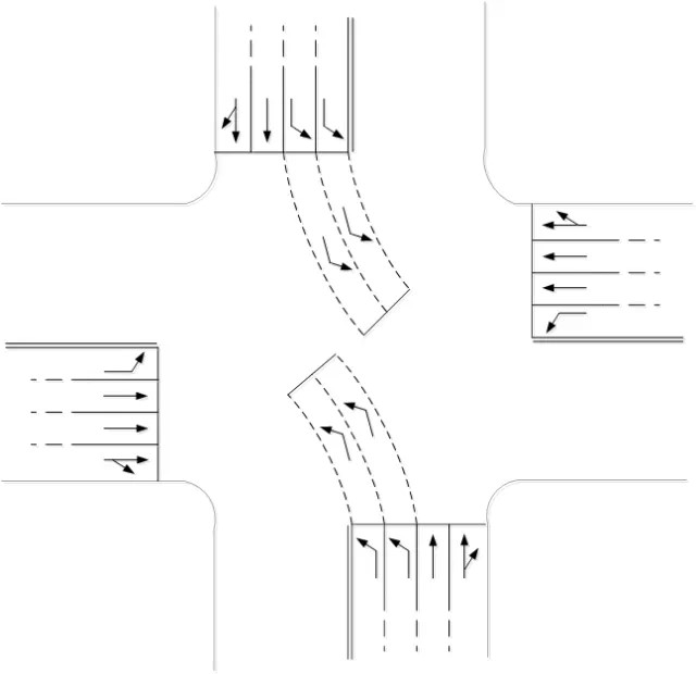 通過時空合理設置使部分左轉車輛提前進入交叉口,充分利用左轉相位的綠燈時間,在一定的綠燈時間內增加通過交叉口的左轉車輛數,從而增大交叉口的通行能力,特別是左轉車的通行能力。