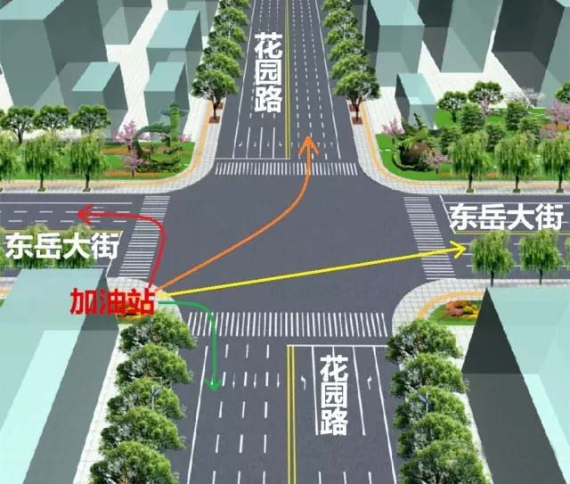 下圖是模擬的東岳大街與花園路路口,這個路口的西南角是一處加油站。
