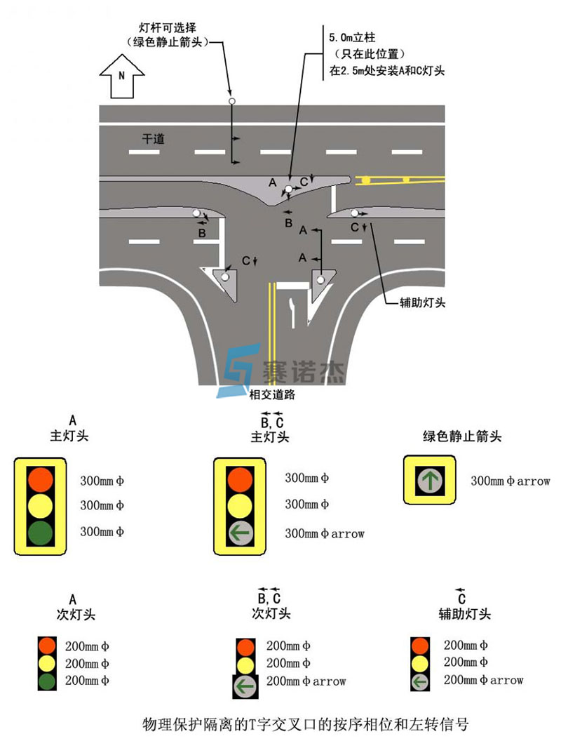 對于簡單的2相位控制的交通信號燈安裝,一般情況下,在道路的下面和左側轉角處分別安裝主信號燈和次信號燈。
