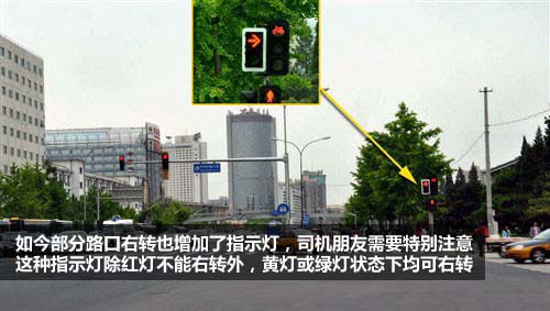 注:這里需要特別說明的是,右轉信號的為箭頭形標識,此標識為紅燈時需要停車等待,無此箭頭燈的情況下右轉無需等待,不過個別路口右轉信號等設置的并不起眼,這就需要我們在通過路口時提前減速注意觀察。