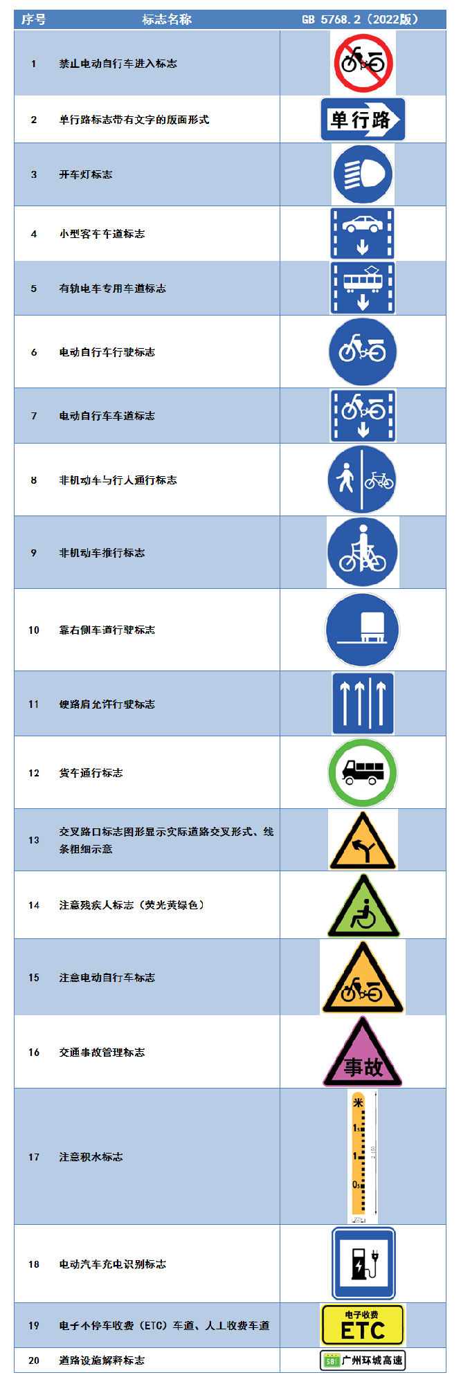 隨著城市化進程的加快,道路基礎設施建設迅速發展,為滿足這些新設施的指引需求,新修訂發布GB5768.2主要增加了以下20類交通標志。