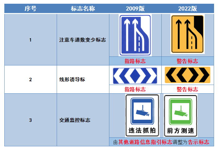 根據實際道路交通環境和應用需求,同時結合2009版原國標使用情況,2022版新國標對以下道路交通標志的種類進行了修改,主要修改標志如下: