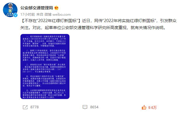 近日,網傳“2022年將實施紅綠燈新國標”,引發群眾關注。對此,起草單位公安部交通管理科學研究所高度重視,現就有關情況作如下說明: