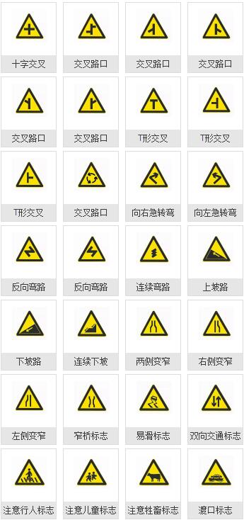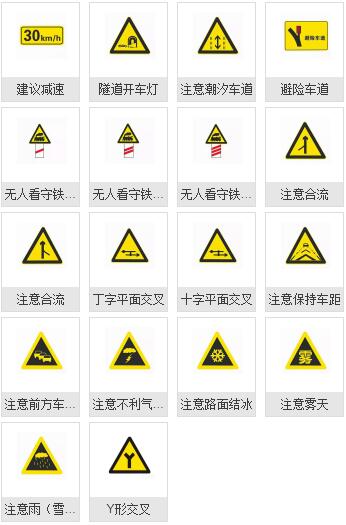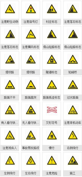警告標志是指警告車輛、行人注意危險地點的標志。警告標志的顏色為黃底、黑邊、黑圖案,形狀為等邊三角形,頂角向上。駕駛人見到警告標志后,應引起注意,謹慎駕駛、減速慢行。
