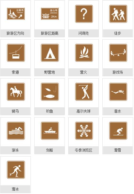 提供旅游景點方向、距離的標志。顏色為棕色底、白色字符,提供旅游區的名稱、有代表性的圖案及前往旅游區的方向和距離,設在高速公路出口附近及通往旅游區的各交叉口的附近。