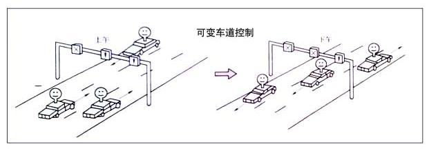 可變車道控制的情況很常見??勺冘嚨揽梢允沟缆吩谔囟〞r段里,某一方向的車道數增加,而在另一特定時段里,對向的車道數增加,這對于道路控制很有好處。