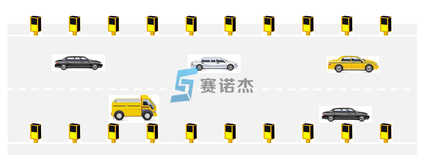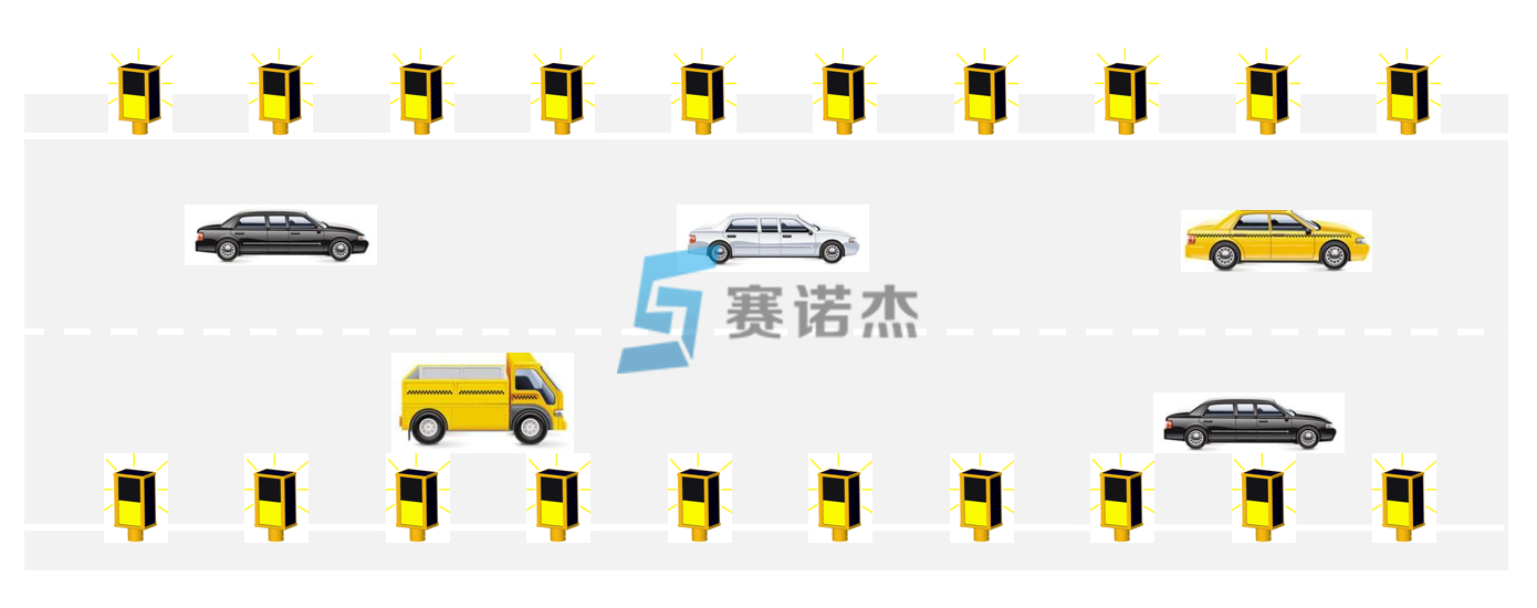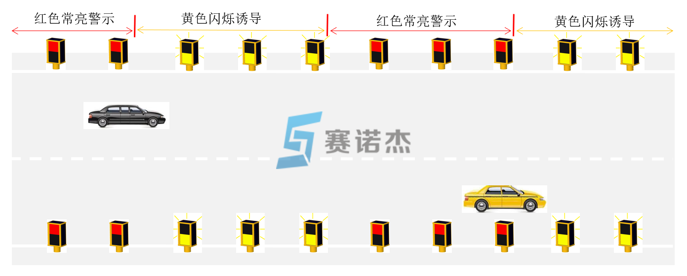 防止追尾警示模式:能見度<200m,車輛經過時,在車后一段距離黃燈閃爍轉換成紅色常亮,形成一段紅色尾跡,警示后車;