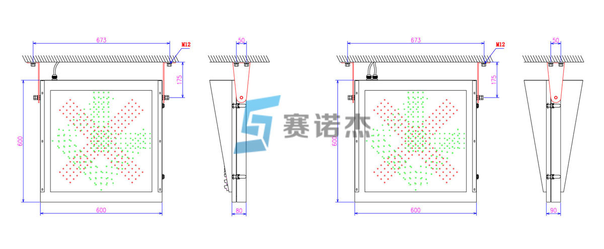 | SW-CKB-600-II-B2SF | 600×600mmLED車道控制標志,LED直插式,雙面發光,紅色“X”,綠色"←"、“↓”,支持反饋電路控制功能,含標配配件 |